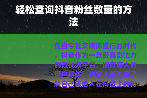 在当今社交媒体盛行的时代,抖音作为一款极具影响力的短视频平台,拥有庞大的用户群体,许多人都希望了解自己或他人在抖音上的粉丝数量,那么怎么查抖音粉丝数量呢?