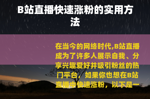 在当今的网络时代,B站直播成为了许多人展示自我、分享兴趣爱好并吸引粉丝的热门平台,如果你也想在B站直播中快速涨粉,以下是一些实用的方法可供参考。