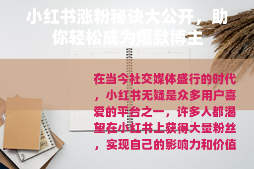 在当今社交媒体盛行的时代,小红书无疑是众多用户喜爱的平台之一,许多人都渴望在小红书上获得大量粉丝,实现自己的影响力和价值,小红书涨粉的秘诀究竟是什么呢?今天就来为大家大公开。