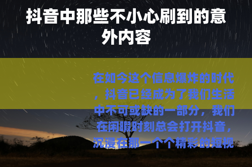尽管我们可能会不小心刷到一些原本不想看的视频,但这也未必是一件坏事,它可能会让我们发现新的兴趣点,拓宽我们的知识面和视野,我们可以在这些意外的相遇中,找到更多的乐趣和惊喜,让我们的抖音之旅变得更加丰富多彩,当我们在抖音上不小心刷到了想看之外的内容时,不妨以一种开放和好奇的心态去对待,也许会有不一样的收获呢。