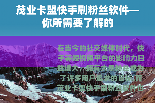在当今的社交媒体时代,快手等短视频平台的影响力日益增大,拥有大量粉丝成为了许多用户追求的目标,而茂业卡盟快手刷粉丝软件也随之进入了人们的视野。