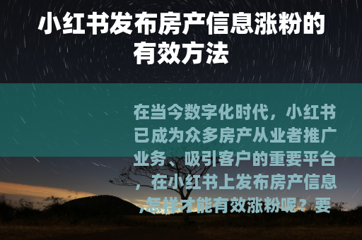 在当今数字化时代,小红书已成为众多房产从业者推广业务、吸引客户的重要平台,在小红书上发布房产信息,怎样才能有效涨粉呢?