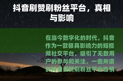 在当今数字化的时代,抖音作为一款极具影响力的短视频社交平台,吸引了无数用户的参与和关注,一些所谓的抖音耍赞刷粉丝平台也悄然兴起,引起了广泛的讨论。