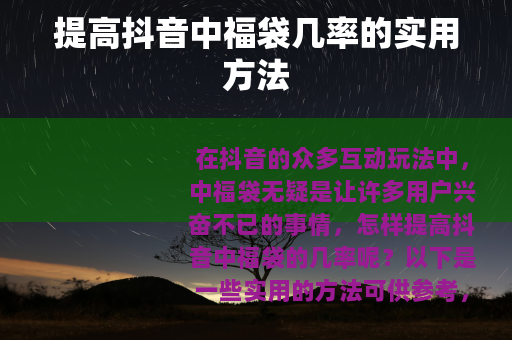 在抖音的众多互动玩法中,中福袋无疑是让许多用户兴奋不已的事情,怎样提高抖音中福袋的几率呢?以下是一些实用的方法可供参考。