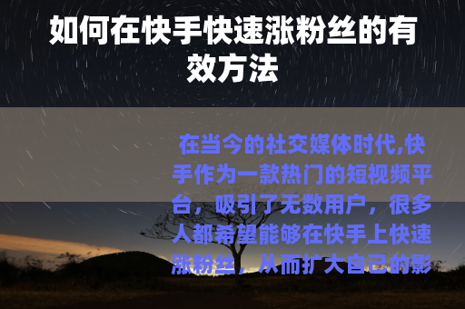 在当今的社交媒体时代,快手作为一款热门的短视频平台,吸引了无数用户,很多人都希望能够在快手上快速涨粉丝,从而扩大自己的影响力和社交圈,以下是一些在快手快速涨粉丝的实用方法。