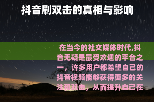 在当今的社交媒体时代,抖音无疑是最受欢迎的平台之一,许多用户都希望自己的抖音视频能够获得更多的关注和双击,从而提升自己在平台上的影响力,而抖音刷双击这一现象也随之出现。
