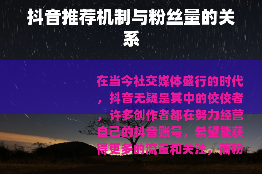 在当今社交媒体盛行的时代,抖音无疑是其中的佼佼者,许多创作者都在努力经营自己的抖音账号,希望能获得更多的流量和关注,而粉丝量,往往被认为是衡量一个账号成功与否的重要指标之一,抖音会根据粉丝量给推荐吗?