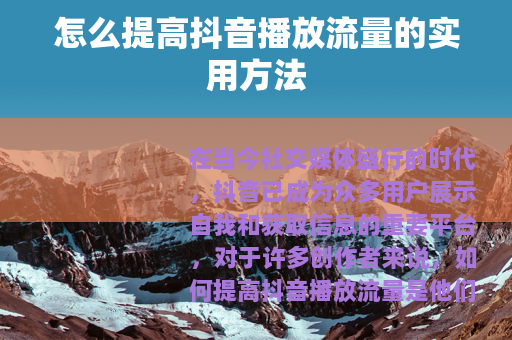 提高抖音播放流量需要从多个方面入手,不断优化内容质量、制作技巧,了解算法规则,加强与用户的互动,并保持稳定的更新,只要你坚持不懈地努力和尝试,相信你的抖音账号一定能够获得更多的播放流量,在抖音平台上取得更好的成绩。