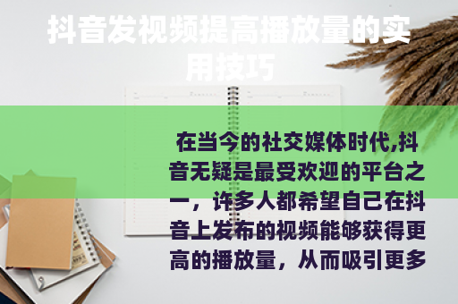 在当今的社交媒体时代,抖音无疑是最受欢迎的平台之一,许多人都希望自己在抖音上发布的视频能够获得更高的播放量,从而吸引更多的关注和粉丝,抖音怎么发视频才能提高播放量呢?以下是一些实用的技巧。 要具有吸引力,这意味着你需要找到一个独特的主题或角度,能够在众多的视频中脱颖而出,你可以分享一些有趣的生活故事、实用的生活小妙招、精彩的才艺表演或者是热门话题的独特见解等,确保你的视频内容能够引起观众的兴趣,让他们愿意花时间观看。