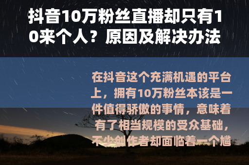 在抖音这个充满机遇的平台上,拥有10万粉丝本该是一件值得骄傲的事情,意味着有了相当规模的受众基础,不少创作者却面临着一个尴尬的局面:即便有10万粉丝,直播时却只有10来个人观看,这究竟是怎么回事呢?