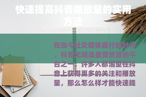 在当今社交媒体盛行的时代,抖音无疑是最受欢迎的平台之一,许多人都渴望在抖音上获得更多的关注和播放量,那么怎么样才能快速提高抖音的播放量呢?以下是一些实用的方法。 创作是关键,要确保你的视频内容具有吸引力和独特性,了解你的目标受众,创作出他们感兴趣的话题和风格的视频,可以是有趣的搞笑段子、实用的生活小技巧、精彩的才艺表演或者是引人深思的观点分享等,只有当你的内容能够引起观众的共鸣和兴趣,他们才会更愿意观看你的视频并分享给他人,从而提高播放量。