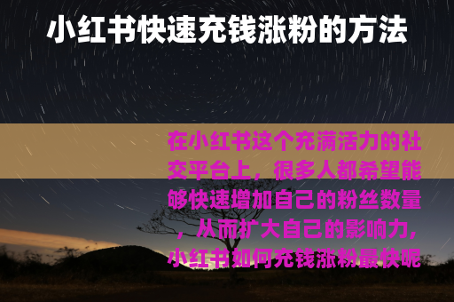 在小红书上充钱涨粉最快需要综合运用多种方法,并且要不断优化和调整自己的策略,以适应平台的规则和用户的需求,这样才能在短时间内实现粉丝数量的快速增长,让你的小红书之旅更加精彩。
