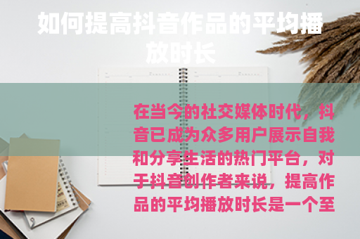 在当今的社交媒体时代,抖音已成为众多用户展示自我和分享生活的热门平台,对于抖音创作者来说,提高作品的平均播放时长是一个至关重要的目标,它不仅能增加作品的曝光度,还有助于提升账号的影响力和粉丝数量,究竟该怎么提高抖音作品平均播放时长呢?以下是一些实用的方法。 的吸引力是关键,要确保你的视频内容具有独特性和趣味性,能够在众多的抖音视频中脱颖而出,可以从热门话题入手,结合自身的特点和优势,创作出新颖的内容,如果你擅长烹饪,那么可以制作一些独特的美食制作视频,在展示美食的制作过程中加入一些有趣的小插曲或独特的烹饪技巧,这样能够吸引更多用户的关注并保持他们的观看兴趣。