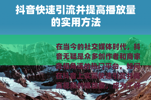 通过以上这些方法的综合运用,相信你在抖音上能够实现快速引流并提高视频的播放量,让你的抖音账号获得更多的关注和成功,不断学习和尝试新的方法,根据用户的反馈和数据分析及时调整策略,才能在竞争激烈的抖音平台上长久立足。
