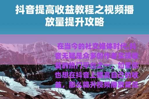 在当今的社交媒体时代,抖音无疑是众多创作者实现收益的热门平台之一,如果你也想在抖音上提高自己的收益,那么提升视频播放量是至关重要的一环,以下是一些关于抖音如何提高收益教程中视频播放量的有效方法。 质量是关键,确保你的视频内容具有独特性、趣味性和实用性,独特的创意能够吸引用户的注意力,让他们在众多视频中选择观看你的作品,趣味性则能让观众在观看过程中感到愉悦,从而更愿意停留并分享你的视频,而实用性强的内容,如生活小妙招、专业知识讲解等,会让用户觉得观看你的视频能获得价值,进而增加对你的关注和忠诚度。