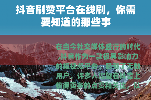 在当今社交媒体盛行的时代,抖音作为一款极具影响力的短视频平台,吸引了无数用户,许多人渴望在抖音上获得更多的点赞和关注,以提升自己的影响力和知名度,一些所谓的“抖音刷赞平台在线刷”服务便应运而生。