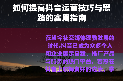 在当今社交媒体蓬勃发展的时代,抖音已成为众多个人和企业展示自我、推广产品与服务的热门平台,若想在抖音上取得良好的成绩,掌握一定的运营技巧和思路至关重要,以下是一些关于如何提高抖音运营技巧和思路的方法。