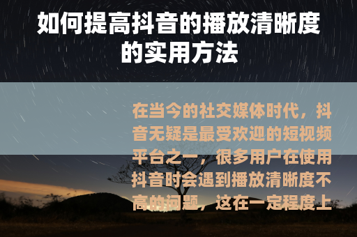在当今的社交媒体时代,抖音无疑是最受欢迎的短视频平台之一,很多用户在使用抖音时会遇到播放清晰度不高的问题,这在一定程度上影响了观看体验,如何提高抖音的播放清晰度呢?以下是一些有效的方法。