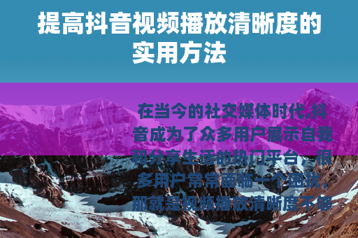 在当今的社交媒体时代,抖音成为了众多用户展示自我和分享生活的热门平台,很多用户常常面临一个困扰,那就是视频播放清晰度不够理想,如何提高抖音视频播放清晰度呢?以下是一些有效的方法。