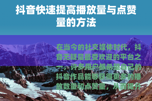 在当今的社交媒体时代,抖音无疑是最受欢迎的平台之一,许多用户都希望自己的抖音作品能够获得更多的播放数量和点赞量,从而提升自己在平台上的影响力,抖音怎样才能快速提高播放数量和点赞量呢?以下是一些有效的方法。 质量是关键,要确保你的视频具有独特性、趣味性和实用性,独特的内容能够吸引用户的注意力,让他们在众多视频中选择观看你的作品,趣味性则能让观众在观看过程中感到愉悦,从而更愿意点赞和分享,你可以通过幽默的表演、新奇的创意或感人的故事来打造有趣的视频,而实用性的内容,如生活小妙招、知识科普等,会让用户觉得观看你的视频能有所收获,进而增加他们对你的关注和喜爱。