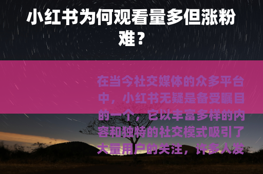 在当今社交媒体的众多平台中,小红书无疑是备受瞩目的一个,它以丰富多样的内容和独特的社交模式吸引了大量用户的关注,许多人发现自己发布的笔记有较高的浏览量,然而涨粉的速度却不尽如人意,甚至出现粉丝量少的情况,这究竟是为何呢?