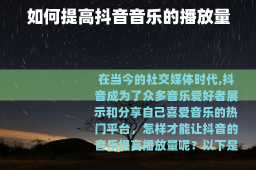 在当今的社交媒体时代,抖音成为了众多音乐爱好者展示和分享自己喜爱音乐的热门平台,怎样才能让抖音的音乐提高播放量呢?以下是一些实用的方法。