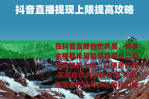 在抖音直播的世界里,许多主播都希望能够提高自己直播提现的上限,以便更好地实现自己的收益目标,究竟有哪些方法可以帮助我们提高抖音直播提现的上限呢?