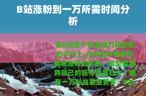 要确切地说B站涨粉到一万需要多久是很难给出一个固定答案的,有些创作者可能在几个月内就能实现这一目标,而对于一些起步较晚或者内容比较小众的创作者来说,可能需要一年甚至更长的时间,但只要坚持优质内容创作,保持积极的运营态度,不断优化自己的创作和推广策略,相信在B站涨粉到一万是完全有可能实现的,并且随着粉丝数量的增长,你的创作之路也会越来越精彩,能在B站这个大舞台上收获更多的认可和支持。