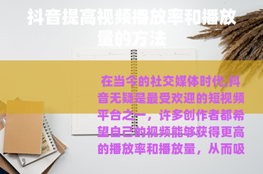 在当今的社交媒体时代,抖音无疑是最受欢迎的短视频平台之一,许多创作者都希望自己的视频能够获得更高的播放率和播放量,从而吸引更多的关注和粉丝,抖音怎么提高视频播放率和播放量呢?以下是一些实用的方法。 是关键,要确保你的视频内容具有吸引力和独特性,可以从热门话题入手,结合自己的风格和特长,创作出能够引起观众兴趣的视频,如果你擅长烹饪,那么可以制作一些独特的美食制作视频,分享一些烹饪技巧和心得,要注意视频的趣味性和实用性,让观众在观看视频的过程中既能获得乐趣,又能学到知识或得到某种启发。