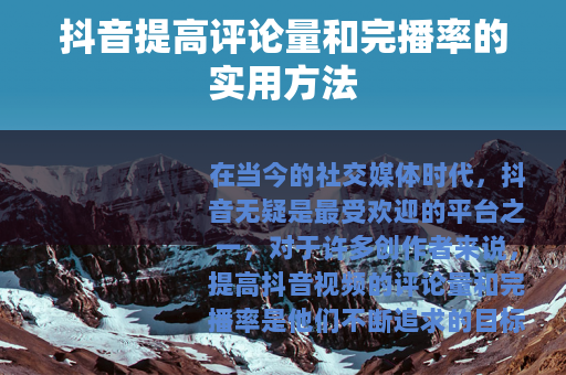 要提高抖音视频的评论量和完播率,需要从内容创作、视频制作、互动运营等多个方面入手,不断优化和改进,才能在抖音这个竞争激烈的平台上获得更多的关注和成功。