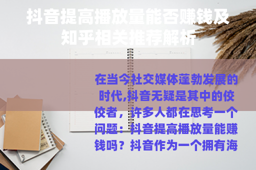 在知乎上关于抖音提高播放量能否赚钱又有哪些推荐呢?在知乎上,有众多用户分享了自己的经验和见解,一些知乎用户推荐通过持续输出优质、有创意的内容来提高播放量,从而实现盈利,他们认为,只有真正满足用户需求,提供有价值的视频,才能吸引更多的观众,进而提升播放量并实现商业变现。