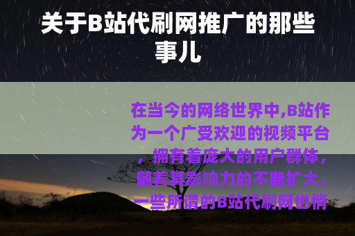 在当今的网络世界中,B站作为一个广受欢迎的视频平台,拥有着庞大的用户群体,随着其影响力的不断扩大,一些所谓的B站代刷网也悄然出现,并且有人试图进行推广。