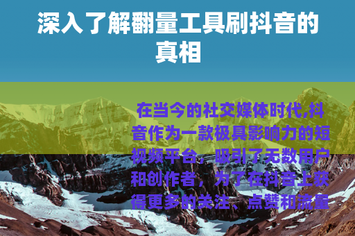 在当今的社交媒体时代,抖音作为一款极具影响力的短视频平台,吸引了无数用户和创作者,为了在抖音上获得更多的关注、点赞和流量,一些人开始寻求各种方法来提升自己的数据,其中翻量工具刷抖音的现象逐渐引起了人们的注意。
