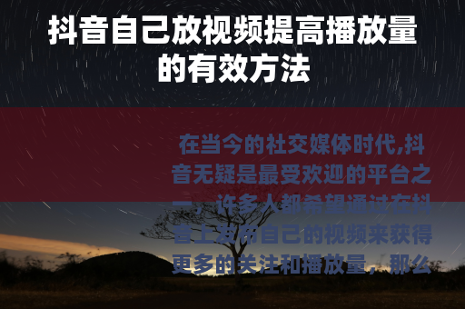 在当今的社交媒体时代,抖音无疑是最受欢迎的平台之一,许多人都希望通过在抖音上发布自己的视频来获得更多的关注和播放量,那么究竟该如何提高抖音自己放视频的播放量呢?以下是一些实用的方法。 是关键,要确保你的视频内容具有吸引力和独特性,可以从自己的兴趣爱好、专业技能或者生活中的有趣经历出发,制作出能够引起观众共鸣的视频,如果你擅长烹饪,那么可以制作一系列精美的美食制作视频,详细展示每一个步骤和独特的烹饪技巧,这样的内容很容易吸引到美食爱好者的关注。