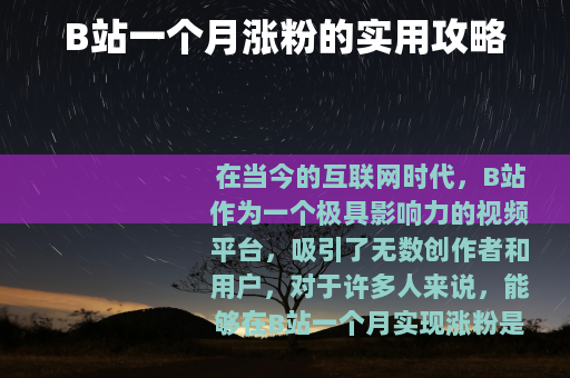 在当今的互联网时代,B站作为一个极具影响力的视频平台,吸引了无数创作者和用户,对于许多人来说,能够在B站一个月实现涨粉是一个非常有吸引力的目标,以下是一些可以帮助你在B站一个月涨粉的有效方法。 质量是关键,要确保你的视频内容有独特性和价值,无论是有趣的搞笑视频、深度的知识讲解,还是精美的动画制作,都要让观众在观看后能有所收获或感到愉悦,如果你擅长烹饪,那么可以制作详细的美食制作教程,从食材准备到烹饪步骤,再到最后的成品展示,都要清晰明了,让观众能够轻松跟着学习,这样的实用内容往往能吸引大量粉丝。