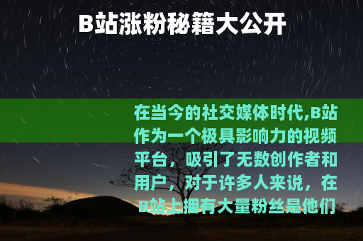 在当今的社交媒体时代,B站作为一个极具影响力的视频平台,吸引了无数创作者和用户,对于许多人来说,在B站上拥有大量粉丝是他们的梦想,B站如何涨粉丝呢?以下是一些实用的方法。 质量是关键,要制作出有创意、有趣且有价值的视频,无论是搞笑、知识科普、美食制作还是游戏攻略等各种类型,都要确保你的视频能够在众多同类内容中脱颖而出,精心策划视频的主题和情节,投入足够的时间和精力去拍摄和剪辑,让观众在观看你的视频时能够获得良好的体验,这样他们才会愿意关注你,成为你的粉丝。