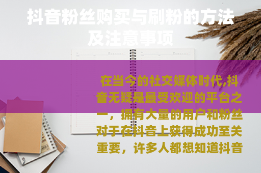 在当今的社交媒体时代,抖音无疑是最受欢迎的平台之一,拥有大量的用户和粉丝对于在抖音上获得成功至关重要,许多人都想知道抖音粉丝怎么买怎么刷,下面就为大家详细介绍一下相关的方法以及需要注意的一些方面。