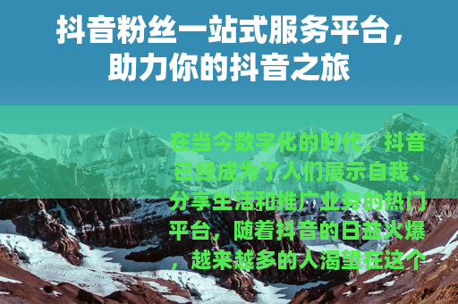 在当今数字化的时代,抖音已经成为了人们展示自我、分享生活和推广业务的热门平台,随着抖音的日益火爆,越来越多的人渴望在这个平台上获得更多的关注和粉丝,以实现自己的各种目标,而抖音粉丝一站式服务平台的出现,为广大用户提供了一个便捷、高效的解决方案。