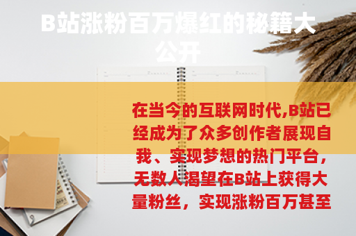 在当今的互联网时代,B站已经成为了众多创作者展现自我、实现梦想的热门平台,无数人渴望在B站上获得大量粉丝,实现涨粉百万甚至爆红的目标,究竟怎样才能在B站上取得如此耀眼的成绩呢? 的独特性是至关重要的,你需要找到自己擅长且与众不同的领域,无论是美食、游戏、科技还是生活趣事等,只有当你的内容具有独特的视角和价值,才能在海量的视频中脱颖而出,吸引用户的关注,有的美食博主会深入探索小众的地方美食,通过生动有趣的介绍和制作过程展示,让观众大开眼界,从而吸引了大量粉丝。