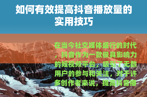 在当今社交媒体盛行的时代,抖音作为一款极具影响力的短视频平台,吸引了无数用户的参与和关注,对于许多创作者来说,提高抖音播放量是他们努力追求的目标,因为这不仅意味着更多的曝光和关注,还可能带来更多的机会和收益,究竟有哪些方法可以有效提高抖音播放量呢?本文将为您详细介绍。