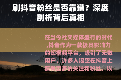 在当今社交媒体盛行的时代,抖音作为一款极具影响力的短视频平台,吸引了无数用户,许多人渴望在抖音上获得更多的关注和粉丝,以提升自己的影响力和商业价值,一个问题应运而生:刷抖音粉丝靠谱吗?