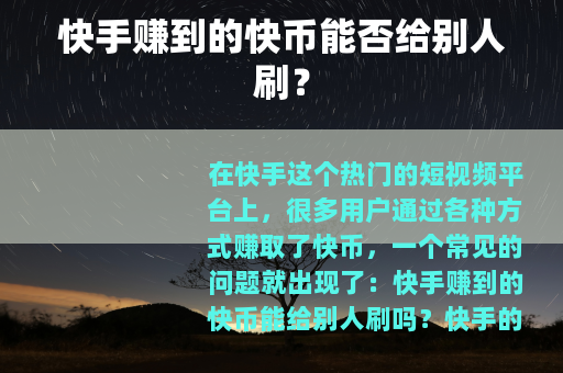 在快手这个热门的短视频平台上,很多用户通过各种方式赚取了快币,一个常见的问题就出现了:快手赚到的快币能给别人刷吗?