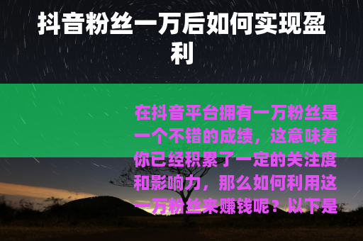 拥有一万抖音粉丝后,通过合理利用这些粉丝资源,采用合适的盈利模式,就可以在抖音平台上实现赚钱的目标,为自己带来更多的价值和收益。