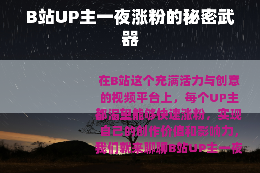 在B站这个充满活力与创意的视频平台上,每个UP主都渴望能够快速涨粉,实现自己的创作价值和影响力,我们就来聊聊B站UP主一夜涨粉的那些事儿,探寻其中的秘密武器,也就是所谓的“百宝箱”。