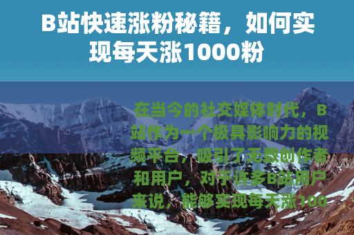 在当今的社交媒体时代,B站作为一个极具影响力的视频平台,吸引了无数创作者和用户,对于许多B站用户来说,能够实现每天涨1000粉是一个非常诱人的目标,这不仅意味着自己的创作得到了更多人的认可,还能为自己在平台上带来更多的机会和影响力,如何才能在B站实现每天涨1000粉呢? 质量是关键,要想吸引粉丝,就必须提供有价值、有趣、有特色的视频内容,这需要创作者深入了解自己的目标受众,明确他们的兴趣和需求,然后根据这些来制定创作方向,无论是搞笑、知识科普、美食制作还是游戏攻略等各种类型的视频,都要确保在内容上做到精益求精,让观众在观看后能够有所收获,或者得到快乐和放松。