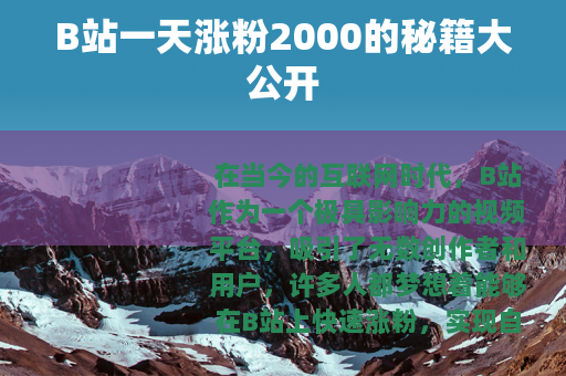 在当今的互联网时代,B站作为一个极具影响力的视频平台,吸引了无数创作者和用户,许多人都梦想着能够在B站上快速涨粉,实现自己的创作价值和影响力,我们就来一起探讨一下如何在B站实现一天涨粉2000的方法。 质量是关键,要想吸引大量粉丝,你的视频必须要有独特的创意和价值,无论是有趣的搞笑视频、专业的知识讲解,还是精彩的生活记录,都要确保能够让观众在观看后有所收获或感到愉悦,在制作视频时,要注重画面的清晰度、声音的质量以及剪辑的流畅性,给观众带来良好的观看体验。