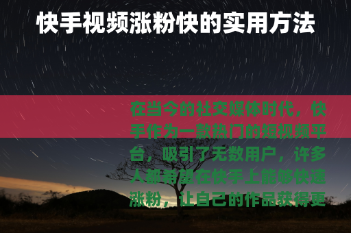 在当今的社交媒体时代,快手作为一款热门的短视频平台,吸引了无数用户,许多人都希望在快手上能够快速涨粉,让自己的作品获得更多的关注和认可,以下是一些快手视频涨粉快的有效方法。 质量是关键,要确保你的视频具有独特性、趣味性和实用性,独特的内容能够让用户在众多视频中一眼就注意到你,趣味性则能吸引他们持续观看,而实用性的内容会让用户觉得关注你能获得有价值的信息,从而更愿意成为你的粉丝,你可以分享一些独特的生活小窍门、有趣的才艺表演或者是专业领域的知识讲解等。