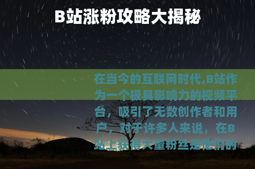 在当今的互联网时代,B站作为一个极具影响力的视频平台,吸引了无数创作者和用户,对于许多人来说,在B站上获得大量粉丝是他们的梦想,那么如何实现B站涨粉呢?以下是一些实用的攻略。 创作是关键,要确保你的视频具有独特性和吸引力,深入了解你的目标受众,明确他们的兴趣和需求,然后根据这些来制作视频内容,如果你发现游戏领域有很多用户对某一款新游戏感兴趣,你可以制作关于这款游戏的攻略、评测或搞笑游戏视频等,要注重视频的质量,包括画面的清晰度、声音的效果以及剪辑的流畅性等,好的质量能让观众更愿意观看你的视频并留下来成为你的粉丝。 和封面的设计也非常重要,一个吸引人的标题能够在众多视频中脱颖而出,引起用户的点击欲望,标题要简洁明了,同时又能准确传达视频的核心内容,封面则要选择视频中最精彩、最有代表性的画面,并且通过一些设计软件进行适当的美化和加工,让封面更具视觉冲击力。