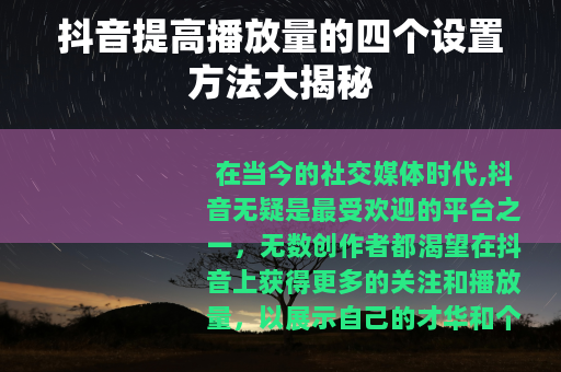 通过以上四个方面的设置,你可以在抖音上更好地展示自己的视频内容,吸引更多的用户关注和观看,从而实现播放量的稳步提升,只要你坚持不懈地优化和改进这些设置,相信你在抖音上一定能取得更好的成绩,让自己的创作之路越走越宽广。