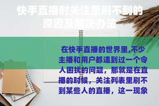 在快手直播的世界里,不少主播和用户都遇到过一个令人困扰的问题,那就是在直播的时候,关注列表里刷不到某些人的直播,这一现象引发了众多人的疑惑和不满,今天我们就来深入探讨一下其中的缘由以及相应的解决方法。